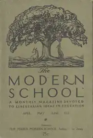 The first, and most notable, of the Modern Schools was founded in New York City, in 1911, two years after Francisco Ferrer i Guàrdia's execution for sedition in monarchist Spain on 18 October 1909. Commonly called the Ferrer Center, it was founded by notable anarchists — including Leonard Abbott, Alexander Berkman, Voltairine de Cleyre, and Emma Goldman — first meeting on St. Mark's Place, in Manhattan's Lower East Side, but twice moved elsewhere, first within lower Manhattan, then to Harlem. The Ferrer Center opened with only nine students, one being the son of Margaret Sanger, the contraceptives-rights activist. Starting in 1912, the school's principal was the philosopher Will Durant, who also taught there. Besides Berkman and Goldman, the Ferrer Center faculty included the Ashcan School painters Robert Henri and George Bellows, and its guest lecturers included writers and political activists such as Margaret Sanger, Jack London, and Upton Sinclair.[19] Student Magda Schoenwetter, recalled that the school used Montessori methods and equipment, and emphasised academic freedom rather than fixed subjects, such as spelling and arithmetic.[20] The Modern School magazine originally began as a newsletter for parents, when the school was in New York City, printed with the manual printing press used in teaching printing as a profession. After moving to the Stelton Colony, New Jersey, the magazine's content expanded to poetry, prose, art, and libertarian education articles; the cover emblem and interior graphics were designed by Rockwell Kent. Artists and writers, among them Hart Crane and Wallace Stevens, praised The Modern School as “the most beautifully printed magazine in existence.”