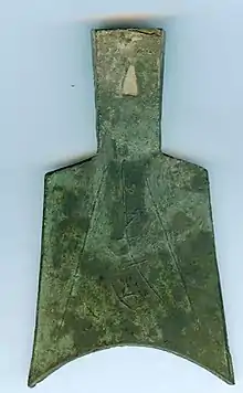 Hollow handled spades (Chinese: 布幣; pinyin: bùbì) are a link between weeding tools used for barter and stylised objects used as money. They are clearly too flimsy for use, but retain the hollow socket by which a genuine tool could be attached to a handle. This socket is rectangular in cross-section, and still retains the clay from the casting process. In the socket the hole by which the tool was fixed to its handle is also reproduced.