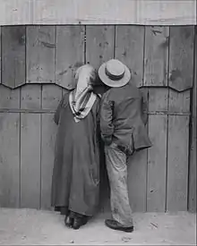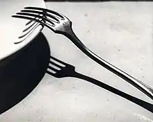 The couple arrived in New York on 15 October 1936, with Kertész intent on finding fame in America.[2] They lived at the Beaux Arts Hotel in Greenwich Village.[5] Kertész found life in America more difficult than he had imagined, beginning a period which he later referred to as the "absolute tragedy".[4] Deprived of his artist friends, he also found that Americans rejected having their photos taken on the street. Soon after his arrival, Kertész approached Beaumont Newhall, director of the photographic department at the Museum of Modern Art (MoMA), who was preparing a show entitled Photography 1839–1937.[5] Offering Newhall some of his Distortions photographs, Kertész bristled at his criticism, but Newhall did exhibit the photographs.[6] In December 1937 Kertész had his first solo show in New York at the PM Gallery.