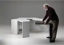 Verroken grew up in the Flemish Ardennes in Flanders (Belgium) where he, like his father, was trained as a furniture maker. After marrying Françoise Willecomme and moving to Brussels where he follows an education at Sint-Lucas School of Architecture and becomes an interior architect and furniture designer. In Brussels he became the father of 3 children : Hendrik (1964), Jan (1965) and Inge (1970). In 1967-1968 he teaches Interior Architecture at the Imelda Institute in Brussels. In 1968 he expanded his career as an interior architect from his home and office in Schaerbeek. In 1969 he designs seating furniture for Spectrum in the Netherlands and meets the Dutch designer Martin Visser whom he will call his first great teacher. In the same year he also befriended the constructivist painter Marcel-Henri Verdren. In 1983 he moves to Ghent, with his new partner and manager of a fabric store Arlette Gesquiere, and starts maki making visual work as a derivative of his furniture designs. In 1983/1984 he became one of the founders and managing director of the Association of Flemish Designers (VVVO). In 1985 he befriends the Basque sculptor Eduardo Chillida to whom he will dedicate a table and furniture design, which in turn will result (in 2007) in a partly posthumous double exhibition Chillida-Verroken. Eventually he moves to Maarkedal where he converts a small warehouse into a design studio and further focuses on designing furniture and visual work. In 2002 he received the Henry van de Velde Prize for Career from the then Flemish Institute for Independent Entrepreneurship (VIZO).[1] In 2016, the municipal council of Maarkedal created a "Special Prize André Verroken" in the context of Z +, a competition for designers, awarded once in 2017.[2]
