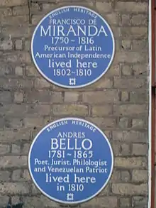 As First Officer of Venezuela's Foreign Secretariat after the coup on April 19, 1810, he was sent to London with Simón Bolívar and Luis Lopez Mendez serving as Diplomatic Representative to procure funds for the revolutionary effort until 1813.[11] Bello landed at Portsmouth as an attache to Bolivar's mission in July 1810.[8] Bello had an admittedly hard life throughout his stay in England, though he managed to further develop his ideas and took a particular interest in England's social changes from the industrial and agricultural revolution.[8] In order to earn a living while in London, Bello taught Spanish and tutored Lord Hamilton's children.[12] In London, he met Francisco de Miranda and became a frequent visitor of his library in Grafton Way, as well as of the British Museum. Along with Bello, Bolivar and López also became friends with Miranda and used their opportunity to become known thanks to Miranda's accomplishments. During his lengthy stay in England, he curbed his feelings of homesickness and became contemporaries with thinkers and intellectuals such as José María Blanco White, Bartólome José Gallardo, Vicente Rocafuerte to name a few. He stayed in London for nineteen years acting as a secretary to legations and diplomatic affairs for Chile and Colombia. In his free time he was involved in study, teaching and journalism.[13] An English Heritage blue plaque commemorates Bello at 58 Grafton Way, his Fitzrovia address.[14]
