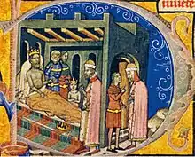 The decisive battle was fought in the regions east of the river Tisza.[45] Andrew suffered injuries and lost the battle.[45][54] He attempted to flee to the Holy Roman Empire, but his brother's partisans routed his retinue at Moson.[45] The Annals of Niederaltaich narrates that wagons and horses trampled him in the battlefield.[57] Deadly wounded in the battlefield, Andrew was seized and taken by his brother's partisans to Zirc[45] where "he was treated with neglect",[58] according to the Illuminated Chronicle.[57] Andrew died in the royal manor there before his brother was crowned king on 6 December 1060.[59] Andrew was buried in the crypt of the church of the Tihany Abbey.[60]