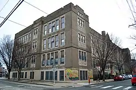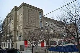 The historic school building was designed by Irwin T. Catharine and built in 1924–1925. It is a three-story, brick and limestone in the Late Gothic Revival-style. It features a projecting center two-story bay, projecting building ends with decorative brick panels, compound arched entrance, and a brick parapet.[4] The roof of the school includes a garden that is used by the local community.