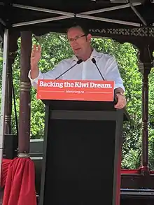 As Leader of the Labour Party and Leader of the Opposition, Little sought to challenge the Government with a strong alternative narrative. In a 2015 conference speech he introduced a new "Kiwi dream" theme (the New Zealand dream).[27] In 2015 Labour introduced a new slogan, "Backing the Kiwi Dream".[28] Little largely focused on issues and concerns such as rising house prices in urban areas, a 'brain drain', unemployment and job security and the growing wage gap between baby boomers and millennials—the "Kiwi dream" narrative was particularly designed to engage young voters.[29]