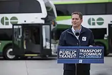 Scheer has described himself as focused on economic development, fiscal restraint, and reducing inefficiencies in government.[5][6] A staunch opponent of the federal carbon tax, he has stated that he would balance the federal budget within two years of forming a government and open up the airline industry to foreign competition.[7][8][9] Scheer has been likened to former Prime Minister Stephen Harper.[10][11][12] On 27 May 2017, he was elected leader of the Conservative Party of Canada.[13] In the 2019 federal election, the Conservatives under Scheer remained the Official Opposition but won the popular vote and gained 22 more seats than in the 2015 election.[14] On 12 December 2019, Scheer announced he would be resigning as the leader of the Conservative Party effective upon the election of a new one.[15][16] He was succeeded as leader by former veterans affairs minister Erin O'Toole on 24 August 2020.