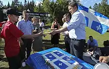 On 28 September 2016, Scheer announced his bid for the leadership of the Conservative Party, and that he had the support of 32 members of the Conservative caucus.[4][58] On 27 May 2017, Scheer was elected as the second full-time leader of the Conservative Party of Canada, beating runner up Maxime Bernier and more than 12 others with 50.95% of the vote through 13 rounds.[13] Bernier later attributed his failure to the "fake conservatives" in the supply management dairy lobby and agricultural sector. Scheer garnered laughs at the annual Press Gallery dinner by joking:[59]