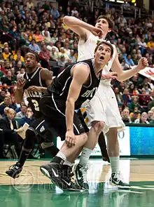 During his sophomore year, Smith played in all 38 games, starting 32.[2] After Butler got off to a mediocre 3–2 start, Smith was added to the starting lineup.[1] Against Cleveland State, he scored a career-high 22 points and collected 10 rebounds to get his first collegiate double-double. In the final game of the regular season, he played a career-high 36 minutes and recorded 11 rebounds, 3 steals, and 3 blocks, all career highs.[2] Thanks in large part to Smith's emergence as a starter, Butler returned to the NCAA Tournament.[4] During the round of 32, Smith hit a go-ahead basket with less than 3 seconds on the clock to help Butler beat top seeded Pittsburgh.[2] In Butler's sweet 16 match against Wisconsin, Smith hurt his ankle and left the game.[4] However, he returned before the game's end, collecting eight points and six rebounds as Butler advanced to the regional final.[4] Butler again advanced to the Championship game. Smith led the team in rebounding in the regional final against Florida and in the National Championship game against Connecticut.[2] He finished the year as the team's second-leading rebounder (5.6 per game) and third-leading scorer (8.5).[2][7] He made 59.3% of his field goal attempts and 67.3% of his free throws.[7]