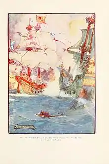 ![]() Sir Andrew with two ships 'The yellow Carvel' and 'The Flower' beat four of the English | |