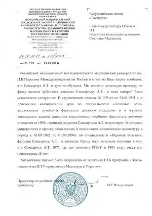 With Chazov's help, at age 12 Slyusarchuk entered the general-therapy department of the Russian State Medical University. He specialized in neurosurgery under Professor E. I. Gusev (Гусев Е.И.), and his teachers included neurologists V. A. Karlov (Карлов В. А.), A. N. Konovalov and A. M. Vein (Вейн А.М.).[81] Slyusarchuk claimed to have graduated from the Russian National Research Medical University with an honorable diploma at 18, beginning a postgraduate course without the usual internship.
