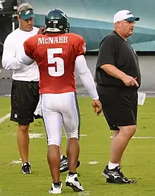 In the 2009 season, Reid failed to win a first-round post-season game for the first time in his career, with his 11–5 Eagles being eliminated by the first place Dallas Cowboys by a score of 34–14 in the Wild Card Round.[44][45] Over the offseason, the Eagles traded longtime starting quarterback Donovan McNabb to the Redskins.[46] After Week 2 of the 2010 season, Reid named Michael Vick the starting quarterback of the Eagles.[47]