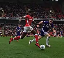 ![]() Yiadom (in red) playing for Barnsley in 2018 | |||