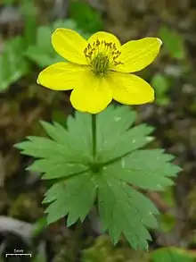 | The yellow flower of Anemonastrum richardsonii, showing above-ground stem and sessile leaves | |