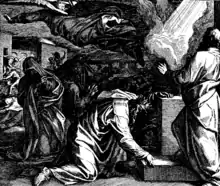 The appearances of the "angel of the Lord" are in fact often presented as theophanies, appearances of YHWH himself rather than a separate entity acting on his behalf.[8] In Genesis 31:11–13, "the angel of God" says, "I am the God of Beth-el". In Exodus 3:2–6 "the angel of Yahweh" (מלאך יהוה) appeared to Moses in the flame of fire, and then "Yahweh" (יהוה) says to him: "I am the God of thy father". Compare also Genesis 22:11; Judges 6:11–22. At times the angel of the Lord speaks in such a way as to assume authority over previous promises (see Gen. 16:11 and 21:17). According to the New American Bible, the visual form under which God appeared and spoke to men is referred to indifferently in some Old Testament texts either as God's angel or as God himself.[9]