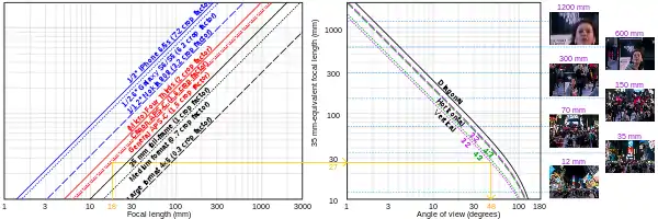 This table shows the diagonal, horizontal, and vertical angles of view, in degrees, for lenses producing rectilinear images, when used with 36 mm × 24 mm format (that is, 135 film or full-frame 35 mm digital using width 36 mm, height 24 mm, and diagonal 43.3 mm for d in the formula above).[18] Digital compact cameras sometimes state the focal lengths of their lenses in 35 mm equivalents, which can be used in this table.