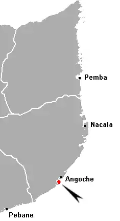 Angoche Island is a small continental island in the district of same name, Mozambique. Being a coastal island its main source of income was the illegal shipment of slaves, which allowed for the enrichment of the aristocratic classes of the Nyapakho clan. It was not taken by the Portuguese until 1913, thanks to the brave resistance of the sultan, particularly Ibrahim Iussuf. His nephew, who was the commander-in-chief of a 30.000 men army took over power and opposed with tenacity the Portuguese until 1890. By then, Farlah, the last sultan resumed the war against the Portuguese until he was captured in a battle in 1910 and deported to East Timor where he died in prison. The small island is subject to cyclones; Cyclone Huda in particular is remembered, and so permanent habitation has not been possible. Angoche is the largest producer of cashew and shrimps in Mozambique.