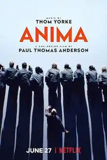 Anima was accompanied by a 15-minute film directed by Paul Thomas Anderson. The Anima film was played in some IMAX theatres and released on Netflix on the day of the album release.[11] It features Yorke's then-girlfriend, actress Dajana Roncione, plus choreography by Damien Jalet and projections by Barri.[3] In the film, Yorke rides a train of uniformed passengers ("Not the News"). He meets the eye of a woman (Roncione), and pursues her when she forgets her bag ("Traffic"). They meet in the street, dance together, and board a tram ("Dawn Chorus").