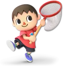 A playable character called "Villager" represents the Animal Crossing series as a fighter in Super Smash Bros. for Nintendo 3DS and Wii U and Super Smash Bros. Ultimate. The character has both male and female forms, which are selected when choosing the character. His or her moves include the ability to catch other players in a net and firing Lloid the gyroid as a missile.[68] Additionally, Isabelle from New Leaf appears as an Assist Trophy,[69] and later appeared as a standalone fighter in Ultimate.[70] Two new Animal Crossing stages appear in the games: "Town & City" from City Folk in the Wii U version, and "Tortimer Island" from New Leaf in the 3DS version.[71] "Smashville" from Brawl returns in the Wii U version.[72]