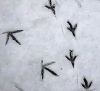 An animal track is an imprint left behind in soil, snow, or mud, or on some other ground surface, by an animal walking across it. Animal tracks are used by hunters in tracking their prey and by naturalists to identify animals living in a given area.[1]