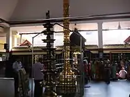 When Anna Nagar was developed as a model town in the late 1960s, the annual vilakku pooja during the mandala makaravilakku season was celebrated by Ayyappa devotees in the newly formed Shanti Colony. The residents' response to this annual celebration resulted in the formation of the Sri Ayyappa Seva Samajam (SASS) in 1976, with 14 members in its committee. In 1979, the Samajam started a charitable medical centre for the poor and needy.[1] The same year, a 7-ground land near the Visveswarayya Tower was allotted to the Samajam by the Tamil Nadu Housing Board for the construction of a temple, for which members contributed ₹ 38,000 towards initial payment.[1] Initially, a makeshift temple was built in a thatched shed along with a charitable medical centre in another shed.[2] Work on the construction of a permanent temple continued for the next five years in consultation with temple architect Kanipayyur Krishnan Namboodiri. The construction was guided by P. N. Subramaniam, the founder-president, P. Chandrasekhara Menon, the second president, and P. V. Nair, and financial support was provided by R. Ratnam, then chairman of Sundaram Industries, and P. Velayudham.[1] In May 1984, the typical Kerala-style temple was completed, conforming to the traditional shastraic stipulations. The kumbabishekam and consecration of the idol were performed on 13 May 1984 by temple Thantri Abli Krishna Vadhyan Namboodiri and K. M. Kesva Battatripad, former chief priest of the Sabarimala Temple.[2] The panchaloka Ayyappan idol was made by Chenganur T. Rajarathinam.[1] Idols of Ganesha, Subramanya, Goddess Durga, and Anjenaya were also consecrated. Later, a Navagraha (the nine planets) shrine was added in the temple. In 1989, a unique architectural structure known as the Natamandapam with an imposing gopuram was added. In 2005, gold covering of the 22-paras (segments) dwajasthambam and 27 thazhikakudams with about 6 kg of gold was completed. A special kumbabishekam of the gold-covered dwajasthambam was performed on 20 June 2005.[2]