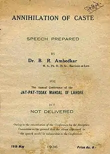 In a letter dated 12 December 1935, the secretary of the Jat-Pat Todak Mandal (Society for the Abolition of Caste system), an anti-caste Hindu reformist group organisation based in Lahore, invited B. R. Ambedkar to deliver a speech on the caste system in India at their annual conference in 1936.[1] Ambedkar wrote the speech as an essay under the title "Annihilation of Caste" and sent in advance to the organisers in Lahore for printing and distribution.[2] The organisers found some of the content to be objectionable towards the orthodox Hindu religion, so intemperate in the idiom and vocabulary used, and so incendiary in promoting conversion away from Hinduism, that they sought the deletion of large sections of the more controversial content endangering Brahmanical interests.[1] They wrote to Ambedkar seeking the removal of sections which they found, in their words, "unbearable.".[1] Ambedkar declared in response that he "would not change a comma" of his text. After much deliberation, the committee of organizers decided to cancel their annual conference in its entirety, because they feared violence by orthodox Hindus at the venue if they held the event after withdrawing the invitation to him.[1] Ambedkar subsequently published 1500 copies of the speech as a book on 15 May 1936 at his own expense as Jat-Pat Todak Mandal failed to fulfill their word.[3][4]