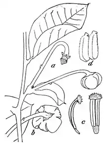 It is a bush 5 to 6 meters (16 to 20 ft) in height. Its branches have inconspicuous, brown lenticels. Its membranous, oval leaves are 3-5 by 2.5-3.2 centimeters with rounded apex that ends in an abrupt small point. The leaves are hairless on their upper surface and on their lower surface except along the midrib and veins when young. The leaves have 10 secondary veins emanating from each side of the midrib. Its petioles 2 millimeters long and have a groove on their upper side. Its recurved peduncles are 2.5-4 centimeters long, extra-axillary and usually emerge opposite a leaf. The peduncles are solitary or in pairs. The peduncles have a bract, covered in rust colored hairs, at their base and another at their midpoint. Its sepals are united to form a calyx with triangular lobes that come to a point. The outer surface of the calyx is covered in rust-colored silky hairs. Its petals are united to form a corolla, 1.5-2.3 centimeters in diameter, consisting of 3 broad lobes alternating with 3 narrow lobes. The outer surface of the corolla is covered in fine rust-colored hairs. The corolla is yellow to ochre-colored with purple spots on the inside. Its stamen are 1.8-2.2 millimeters long with flat filaments. The connective tissue between the lobes of the anther is extended to form a cap. Its flowers have multiple carpels that form a cone-shaped gynoecium. Its 4-sided, prism-shaped ovaries are 0.9-1 millimeters long. Its fleshy, quadrangular styles are 0.9-1 millimeters long and terminate in ovoid stigmas. The outermost styles are covered in fine glandular hairs. The mature orange fruit are 5 centimeters in diameter and 7 centimeters long.[5][4][6]
