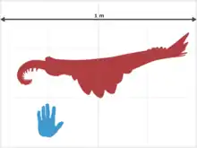 For the time in which it lived, Anomalocaris was gigantic, up to 1 metre (3.3 feet) long.[2] It propelled itself through the water by undulating the flexible flaps on the sides of its body.[11] Each flap sloped below the one more posterior to it,[12] and this overlapping allowed the lobes on each side of the body to act as a single "fin", maximizing the swimming efficiency.[11] The construction of a remote-controlled model showed this mode of swimming to be intrinsically stable,[13] implying that Anomalocaris would not have needed a complex brain to manage balance while swimming. The body was widest between the third and fifth lobe and narrowed towards the tail; it was thought to have at least 11 pairs of flaps in total. It is difficult to distinguish lobes near the tail, making an accurate count difficult.[12] Later studies reveal that it had 13 pairs on the trunk region and additional 3 pairs of small flaps on the neck region.[14]