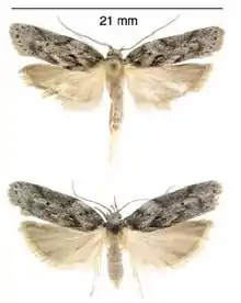 The forewing length is 9–11 mm and the wingspan is about 21 mm. Adults are on wing from mid-June to October, suggesting more than one generation.