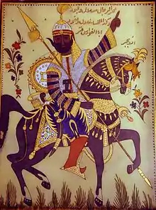 ʿAntarah was born in Najd in Arabia. His father was Shaddād al-ʿAbsī, a respected warrior of the Banu Abs under their chief Zuhayr.[1] His mother was an Ethiopian woman named Zabeebah.[2] She was a princess taken as a captive by his father as a slave during one of the tribe's raids against Axum.[1] Described as an "Arab crow" (al-aghribah al-'Arab) owing to his dark complexion,[3]ʿAntarah grew up a slave as well. He fell in love with his cousin ʿAblah, but could not hope to marry her owing to his position.[1] He also gained the enmity of his father's wife Shammeah.[1]