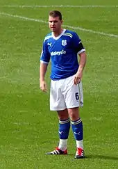 At the start of the season, Gerrard was chosen as first choice centre-back, alongside club captain Mark Hudson and went on to make his League debut for the Bluebirds against Scunthorpe United in the first League match at the Cardiff City Stadium, as Cardiff went on to win 4–0.[45] His first goal came on 20 October 2009 against Coventry City during a 2–0 victory.[46] Gerrard made his 200th club appearance in a 1–1 draw with Nottingham Forest on 1 November 2009[47] and scored his second goal for the club on 9 February 2010, in a 2–0 win over Peterborough United.[48] After suffering a calf injury that kept him sidelined for four matches,[49] Gerrard made his return to the team and set up one of Michael Chopra's goals, in a 2–1 win over rivals, Swansea City on 3 April 2010.[50] In his first season at Cardiff City, Gerrard finished the season, making 39 appearance and scoring two times.