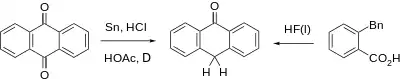 An alternative synthesis involves cyclization of o-benzylbenzoic acid induced with hydrogen fluoride.[3]