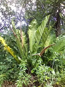 Anthurium schlechtendalii is found from Mexico to Costa Rica.[2] It is a large herbaceous plant with dark green leaves, it arises from a bunch of white cord-like roots and its flower is a dark purple bract(spathe). It has fruits and when ripe they have a similar appearance to small red berries. They tend to live in wet forests, rocky hillsides or outcrops on trees.[3]