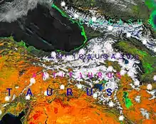 The Anti-Taurus (Greek: Αντίταυρος, Latin: Anti-Taurus (ANTITAVRVS), its western part is called today by the Turks Aladağlar) is the central chain of the mountain ranges of the Armenian Highlands, which runs from west to east across Western Armenia parallel to the Armenian Taurus. The Anti-Taurus consists of two parts, western and eastern. In the west, the Anti-Taurus departs north of the Cilician Taurus, and passing through the center of the Armenian plateau, ends in the east with the Ararat summits. The highest point of the Anti-Taurus is Mount Ararat, which is the highest peak of the Armenian Highlands and all of Turkey and also the highest mountain in the world from the foot to the crown(relative to the plain), the height of the cone above sea level is 5165 meters, the distance from the foot to the top - 4365 meters.