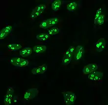 Indirect immunofluorescence is one of the most commonly used tests for ANAs. Typically, HEp-2 cells are used as a substrate to detect the antibodies in human serum. Microscope slides are coated with HEp-2 cells and the serum is incubated with the cells. If the said and targeted antibodies are present then they will bind to the antigens on the cells; in the case of ANAs, the antibodies will bind to the nucleus. These can be visualised by adding a fluorescent tagged (usually FITC or rhodopsin B) anti-human antibody that binds to the antibodies. The molecule will fluoresce when a specific wavelength of light shines on it, which can be seen under the microscope. Depending on the antibody present in the human serum and the localisation of the antigen in the cell, distinct patterns of fluorescence will be seen on the HEp-2 cells.[50][51] Levels of antibodies are analysed by performing dilutions on blood serum. An ANA test is considered positive if fluorescence is seen at a titre of 1:40/1:80. Higher titres are more clinically significant as low positives (≤1:160) are found in up to 20% of healthy individuals, especially the elderly. Only around 5% of the healthy population have ANA titres of 1:160 or higher.[7][52]