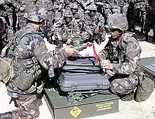The anti-personnel obstacle breaching system originated as an operational requirements document published by the US Army Engineer School, Fort Leonard Wood, MO. The joint requirements document was subsequently signed by the Army and the Marines on 11 April 1994. The system was developed by the United States Army Research, Development and Engineering Command – Armament Research, Development and Engineering Center (RDECOM-ARDEC), Picatinny Arsenal, New Jersey, and produced by Ensign-Bickford Aerospace and Defense. During preliminary test and evaluation, the original explosive grenade attachment scheme proved inadequate, resulting in program delay and the Naval Surface Warfare Center sponsoring a complete line-charge analysis and manufacturing redesign.[1] The subsequently proposed and highly successful woven nylon over-wrap is currently employed on the Mk 7 Mod 1, fielded in 2002, and the Mod 2 fielded in 2006.