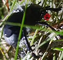 Some prey animals are able to eject noxious materials to deter predators actively. The bombardier beetle has specialized glands on the tip of its abdomen that allows it to direct a toxic spray towards predators. The spray is generated explosively through oxidation of hydroquinones and is sprayed at a temperature of 100 °C.[57] Armoured crickets similarly release blood at their joints when threatened (autohaemorrhaging).[58] Several species of grasshopper including Poecilocerus pictus,[59] Parasanaa donovani,[59] Aularches miliaris,[59] and Tegra novaehollandiae secrete noxious liquids when threatened, sometimes ejecting these forcefully.[59] Spitting cobras accurately squirt venom from their fangs at the eyes of potential predators,[60] striking their target eight times out of ten, and causing severe pain.[61] Termite soldiers in the Nasutitermitinae have a fontanellar gun, a gland on the front of their head which can secrete and shoot an accurate jet of resinous terpenes "many centimeters". The material is sticky and toxic to other insects. One of the terpenes in the secretion, pinene, functions as an alarm pheromone.[62] Seeds deter predation with combinations of toxic non-protein amino acids, cyanogenic glycosides, protease and amylase inhibitors, and phytohemaglutinins.[55]