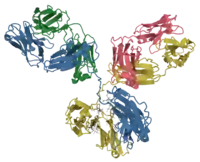 An antibody (Ab), also known as an immunoglobulin (Ig),[1] is a large, Y-shaped protein used by the immune system to identify and neutralize foreign objects such as pathogenic bacteria and viruses. The antibody recognizes a unique molecule of the pathogen, called an antigen.[2][3] Each tip of the "Y" of an antibody contains a paratope (analogous to a lock) that is specific for one particular epitope (analogous to a key) on an antigen, allowing these two structures to bind together with precision. Using this binding mechanism, an antibody can tag a microbe or an infected cell for attack by other parts of the immune system, or can neutralize it directly (for example, by blocking a part of a virus that is essential for its invasion).