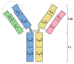 In humans and most mammals, an antibody unit consists of four polypeptide chains; two identical heavy chains and two identical light chains connected by disulfide bonds.[8] Each chain is a series of domains: somewhat similar sequences of about 110 amino acids each. These domains are usually represented in simplified schematics as rectangles. Light chains consist of one variable domain VL and one constant domain CL, while heavy chains contain one variable domain VH and three to four constant domains CH1, CH2, …[9]