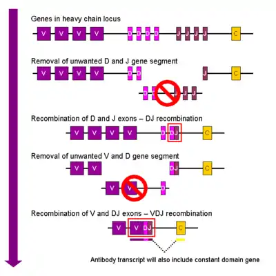 Somatic recombination of immunoglobulins, also known as V(D)J recombination, involves the generation of a unique immunoglobulin variable region. The variable region of each immunoglobulin heavy or light chain is encoded in several pieces—known as gene segments (subgenes). These segments are called variable (V), diversity (D) and joining (J) segments.[39] V, D and J segments are found in Ig heavy chains, but only V and J segments are found in Ig light chains. Multiple copies of the V, D and J gene segments exist, and are tandemly arranged in the genomes of mammals. In the bone marrow, each developing B cell will assemble an immunoglobulin variable region by randomly selecting and combining one V, one D and one J gene segment (or one V and one J segment in the light chain). As there are multiple copies of each type of gene segment, and different combinations of gene segments can be used to generate each immunoglobulin variable region, this process generates a huge number of antibodies, each with different paratopes, and thus different antigen specificities.[41] The rearrangement of several subgenes (i.e. V2 family) for lambda light chain immunoglobulin is coupled with the activation of microRNA miR-650, which further influences biology of B-cells.