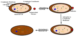Antimicrobial agents kill bacteria through different methods depending on the type of bacteria. Most antiseptics and disinfectants kill bacteria immediately on contact by causing the bacterial cell to burst, or by depleting the bacteria's source of food preventing bacterial reproduction, also known as bacterial conjugation.[2] Antimicrobial polymers commonly kill bacteria through this first method, which is accomplished through a series of steps, shown in Figure 1.[1] First, the polymer must adsorb onto the bacterial cell wall. Most bacterial surfaces are negatively charged, therefore the adsorption of polymeric cations has proved to be more effective than adsorption of polymeric anions. The antimicrobial agent must then diffuse through the cell wall and adsorb onto the cytoplasmic membrane. Small molecule antimicrobial agents excel at the diffusion step due to their low molecular weight, while adsorption is better achieved by antimicrobial polymers. The disruption of the cytoplasmic membrane and subsequent leakage of cytoplasmic constituents leads to the death of the cell. Comparison of small molecule antimicrobial agents and antimicrobial polymers are shown in the following table:[1]