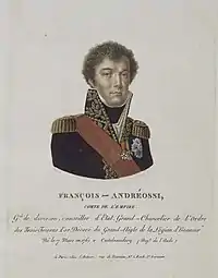 Andréossy held high administrative office under the Bourbon Restoration, including Chief of General Staff and Councillor of State. He was awarded honorary fellowship of the Académie des Sciences Morales et Politiques in 1826,[1][5] He was later elected to the Chamber of Deputies in 1827, representing Aude as Deputy until his death in 1828.[1][6] His name is inscribed in his memory under the Arc de Triomphe.[7]