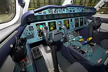 The An-148 aircraft is a high-wing monoplane with two turbofan jet engines mounted in pods under the wing. This arrangement protects the engines and wing structure against foreign object damage. A built-in autodiagnosis system, auxiliary power unit, and the wing configuration allow the An-148 to be used at poorly equipped airfields. Flight and navigation equipment features five 15 by 20 cm (5.9 by 7.9 in) liquid crystal display panels built by Russia's Aviapribor and a fly-by-wire system, which enables the An-148 aircraft to operate day and night, under instrument flight rules and visual flight rules weather conditions on high-density air routes. Similar to the Boeing 737, the main landing gear rotates into the belly of the aircraft when in flight, with partial doors covering the legs, and the sides of the tires remaining exposed. Built-in entrance stairs enable boarding and disembarking the aircraft without extra ground equipment.[10] The manufacturer claims high fuel efficiency of the Motor Sich D-436-148 engines.[10]