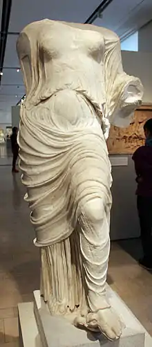 Aphrodite Urania (Ancient Greek: Ἀφροδίτη Οὐρανία, romanized: Aphrodítē Ouranía) was an epithet of the Greek goddess Aphrodite, signifying "heavenly" or "spiritual", to distinguish her from her more earthly aspect of Aphrodite Pandemos, "Aphrodite for all the people".[2] The two were used (mostly in literature) to differentiate the more "celestial" love of body and soul from purely physical lust. Plato represented her as a daughter of the Greek god Uranus, conceived and born without a mother.[3][4] According to Hesiod, she was born from the severed genitals of Uranus and emerged from the sea foam.[5]