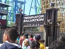 Terminator Salvation: The Ride was originally announced as Terminator: The Coaster, but the name was later changed to coincide with the then-upcoming Terminator Salvation movie.[1] Six Flags spent approximately $1 million on the ride's theme surrounding the film, most of which was placed in the line queue area.[1] Guests waiting in line would also enter a preshow theater complete with video footage that featured actors from the film.[2] The theme's storyline focused on trainees in a post-apocalyptic setting getting trapped by attacking machines at the amusement park, and the coaster serves as transportation to a safe house location.[2] During the ride, the train would pass by pyrotechnic fireball effects and through three tunnels filled with a fog-like cooling mist.[1][2] Each train also featured onboard audio, considered a first for a wooden roller coaster.[1]