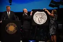 Artists at the Mint produced three designs for the reverse, and in June 2017, both CFA and CCAC agreed on one of them.[25] That design was by U.S. Mint Sculptor-Engraver Phebe Hemphill, who also engraved her side of the coin.[19] The two winning designs were unveiled on October 11, 2018 at the National Air and Space Museum in Washington, DC in the presence of dignitaries such as Mint Director David J. Ryder and Apollo 7 astronaut Walt Cunningham. At the unveiling, Ryder stated the five-ounce silver dollars, once placed on sale, could sell out in ten minutes.[26]