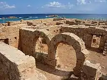Apollonia is particularly known for its ruins of three churches (out of five originally standing) dating from the Byzantine period. They are located at the south, center and east of the governor's palace. The eastern one, dating the 5th century, was the most important. The marble columns used in the nave were reused as Spolia and come originally from Euboea.[7]