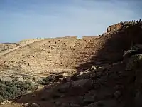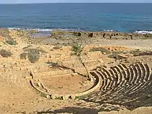 The well-preserved Greek theatre stands facing the sea outside the old city walls. This monument dates the 3rd century BCE and is therefore one of the oldest sites in Apollonia. The structure was modified under Domitian, suggesting its use as an arena for gladiatorial fights.[10] The 5th century saw the abandonment of the theatre and the re-use of the columns from the stage as spolia in the eastern basilica.The cavea has 28 seat levels.