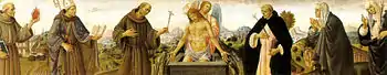The panel has a predella with Christ Hold by an Angel and Six Saints.