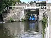 The bridge from which the village takes its name was built in the late-16th century or early-17th century.[2] In 1777 a stone arched bridge was built on Harrogate Road over the canal but the present bridge dates from 1936 and has since been widened.[3] From 1846 until its closure in 1965, Apperley Bridge railway station was situated across the boundary in Rawdon.[4] Off Tenterfields close to the canal were four 19th-century mills; Apperdale Mill (formerly Dyehouse Mill), Oaklea Mills, Valley Mills (Canal Mills) and Whitfield Mill.[3] Apperdale Mill and Oaklea Mills survive close to the canal basin, which is now a pleasure boat marina. Since the 1990s housing has been built in the Tenterfields area between the canal up to Greengates. Valley Mills and Whitfield Mills were demolished to make way for the development, while Apperdale Mill and Oaklea Mill were converted into residential units. Apperley Bridge has a strong thriving local community group - Greengates and Apperley Brdige community volunteers - who organise weekly litter picking and community events/activities Hammonds sauce factory on Harrogate Road close to the canal has been replaced by modern development. In the 2000s the village was considered for conservation area status but was turned down partly because many of its older buildings already had listed building status.[5]