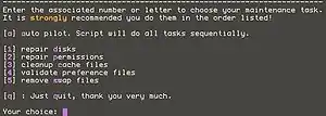 AppleJack was a command-line interface for Mac OS X that provided a simplified user interface for single user mode system repairs. It allowed for permission repair, disk repair, cache cleaning, validation of preference- and property list files, and removal of swap files on a boot drive, without needing a separate startup disk.