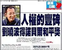 ![]() Front page on 9 October 2010 (English: "Monument of human rights: Liu Xiaobo awarded Nobel Peace Prize") | |